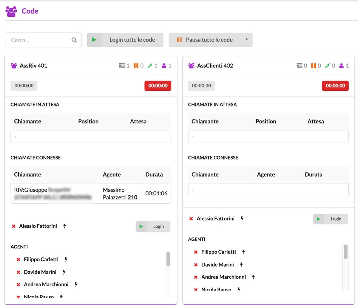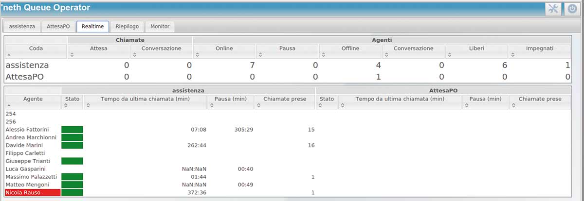 This is the operator interface central to the CallCenter from which you perform the daily activities of login / logout / pause, as well as view (if provided with appropriate permissions) realtime monitor queue: current calls, waiting and connected operators.