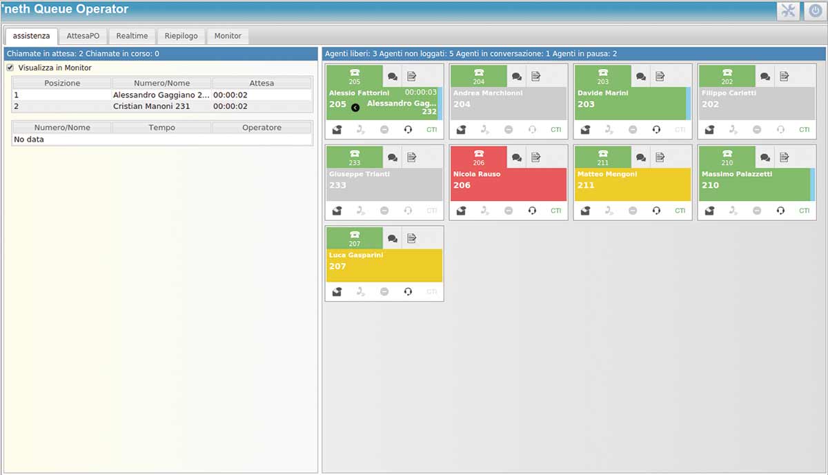 A dedicated tool for the call center administrator to monitor the status of queues and operators, the daily statistics and realtime monitor, as well as interact with the operator management (login / pause) or interfere in conversations for training or quality activities assurance.