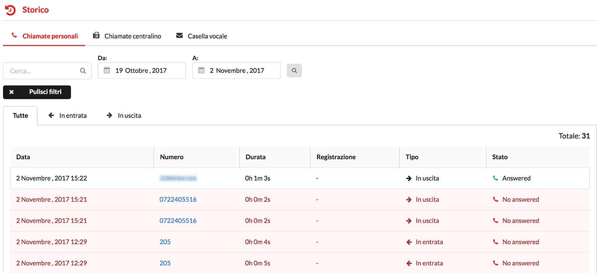 NethVoice has a rich reporting from the simple register of personal and business calls (Receipts / Revenue / Missed / SMS ...) to a detailed statistical analysis relating to telephone charges (dialed) and call centers (incoming calls).