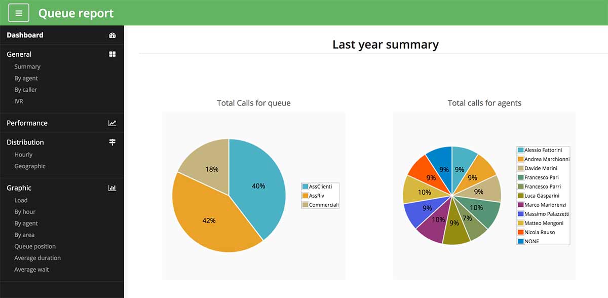 NethVoice offers performance monitoring through summary dashboards and analytics, constantly monitoring the effectiveness and quality of work of its employees (amount, duration, waiting, origin, time distribution, SLA, abandonment ...).